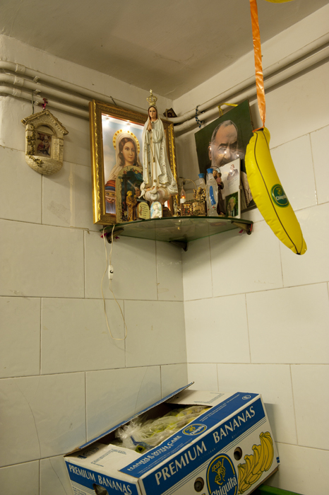 At 11am I was at the shop and Antonio, with whom we spoke yesterday, was welcoming me warmly. It’s a family run business, of course. Father, mamma, three brothers, daughters in law, nieces and nephews and cousins. It’s a famous shop, they sell very fresh and only Italian produce – simply divine. Having been a fruit and veg seller all their lives, they have perfected the know-how to seduce customers to buy more than initially intended. It’s a pleasure to observe the brothers selling and my aim was to capture the typical Neapolitan gestures whilst their were selling their produce. Going for shopping in these kind of shops is not purely for the sake of buying food, it’s a meeting point, the owner know his clients and a chat or even a discussion is well part of the process. I was also looking to find some interesting details inside the shop and I found three different religious altars, decorated with plastic flowers and many photos. The reportage shots I took with the D700 and I also made some portraits with the Kiev. Funnily enough when I was setting up the portraits a man passed by and he recognized the camera, he is a lab technician and a passionate photographer and he knew that it was a copy of Hasselblad… The other, less amusing thing to mention is, that youngsters tried to snatch my D700 when they were passing by with the Vespa. Though it wasn’t that dangerous considering the fact that I was surrounded by a lot of people from the shop and onlookers. But it was a wake up call to be really careful of what could happen. Many Neapolitans have warned me from that…!